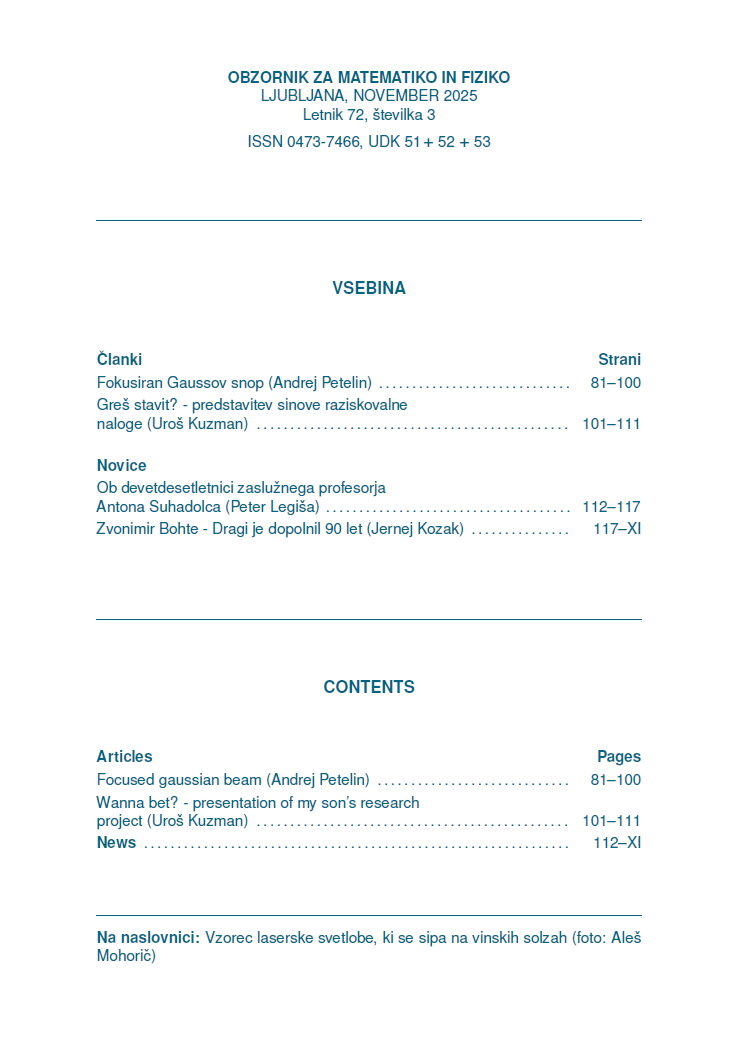 Izšla je nova številka revije OMF, ki prinaša zanimiva članka iz področij matematike in fizike in dva prispevka o življenjskih jubilejih, ki sta jih praznovala prof. Anton Suhadolc in prof. Zvonimir Bohte. Elektronska verzija (PDF) zadnje številke je dosegljiva tukaj, arhiv starih številk pa najdete v zavihku Založba/Obzornik za matematiko in fiziko. Vabljeni k branju!